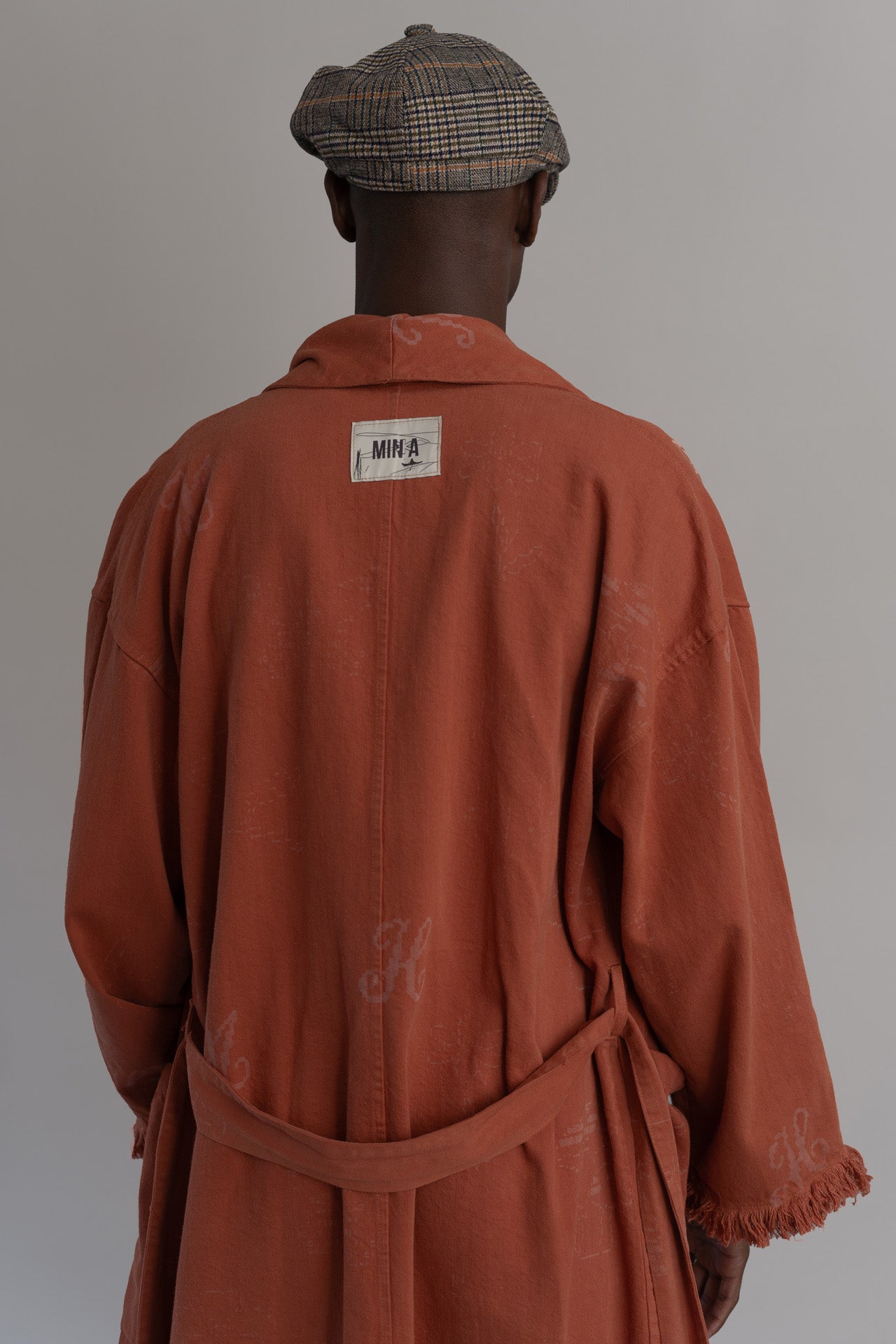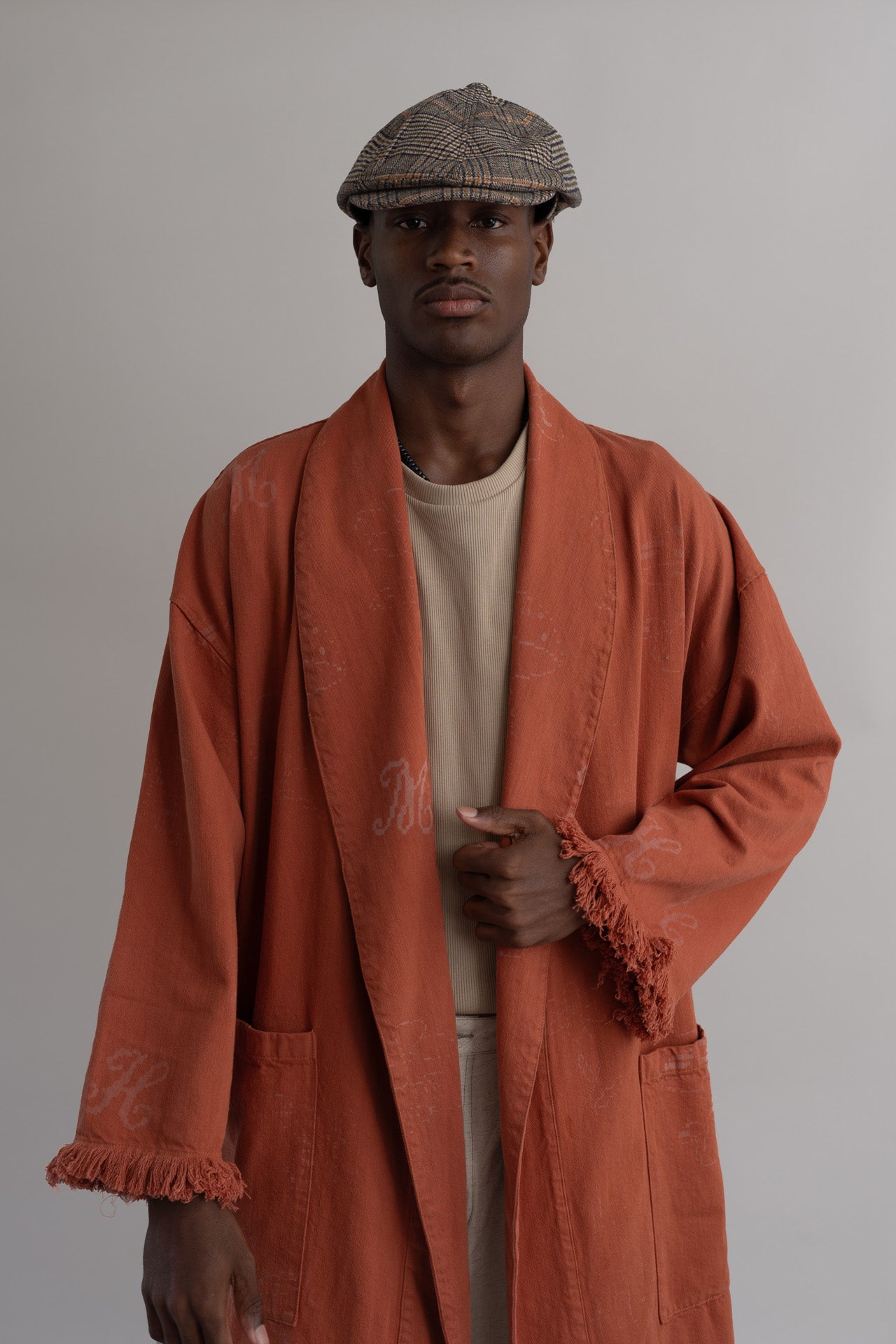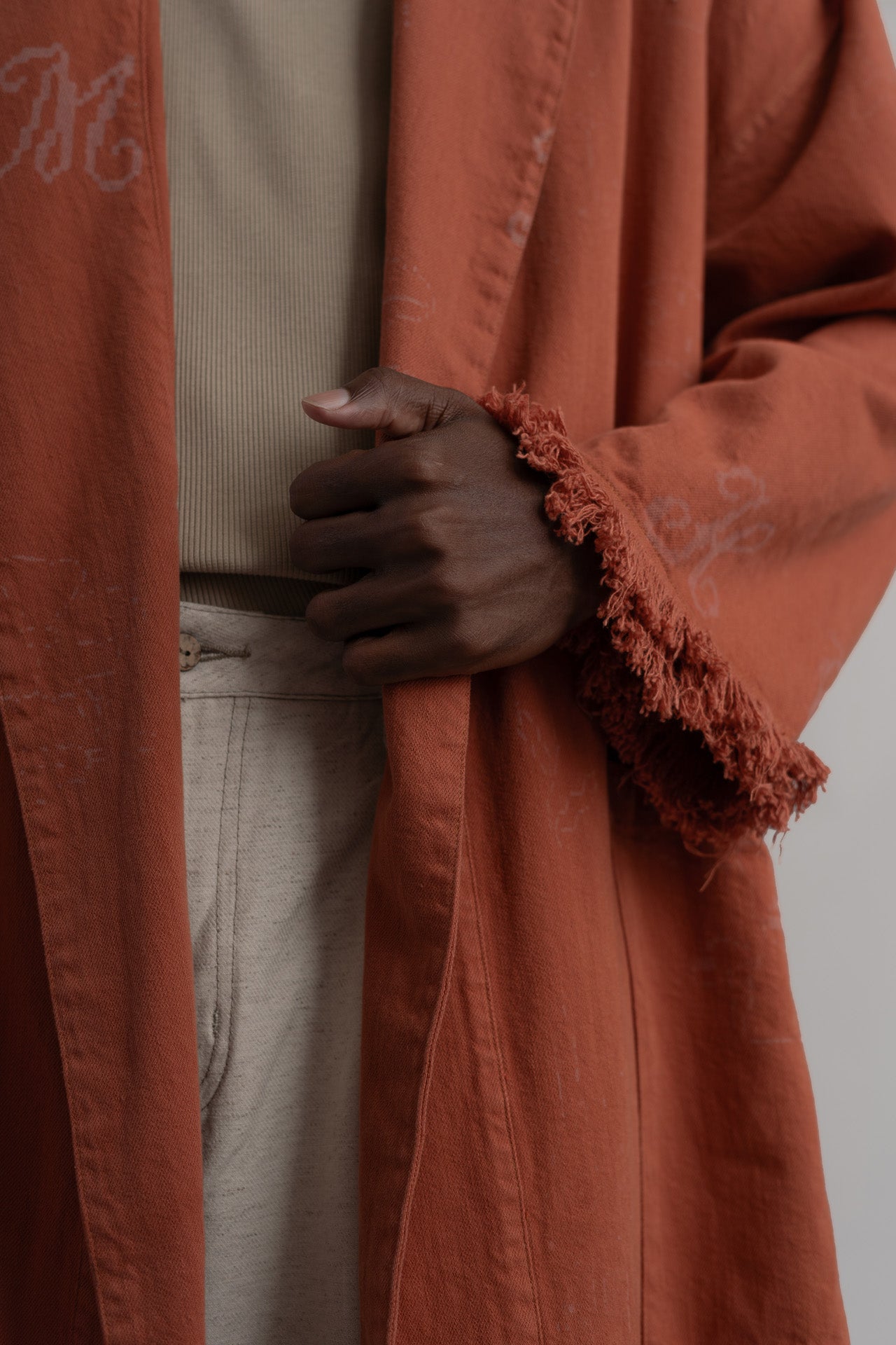 Inspirada en las prendas que te acompañan a desayunar la robe terracota es una tercera pieza que se envuelve alrededor del cuerpo y es ideal para crear looks effortless que crean conversaciones. Hecha en una combinación de algodón BCI y algodón reciclado de origen colombiano con estampados inspirados en el ascii art hechos a láser.