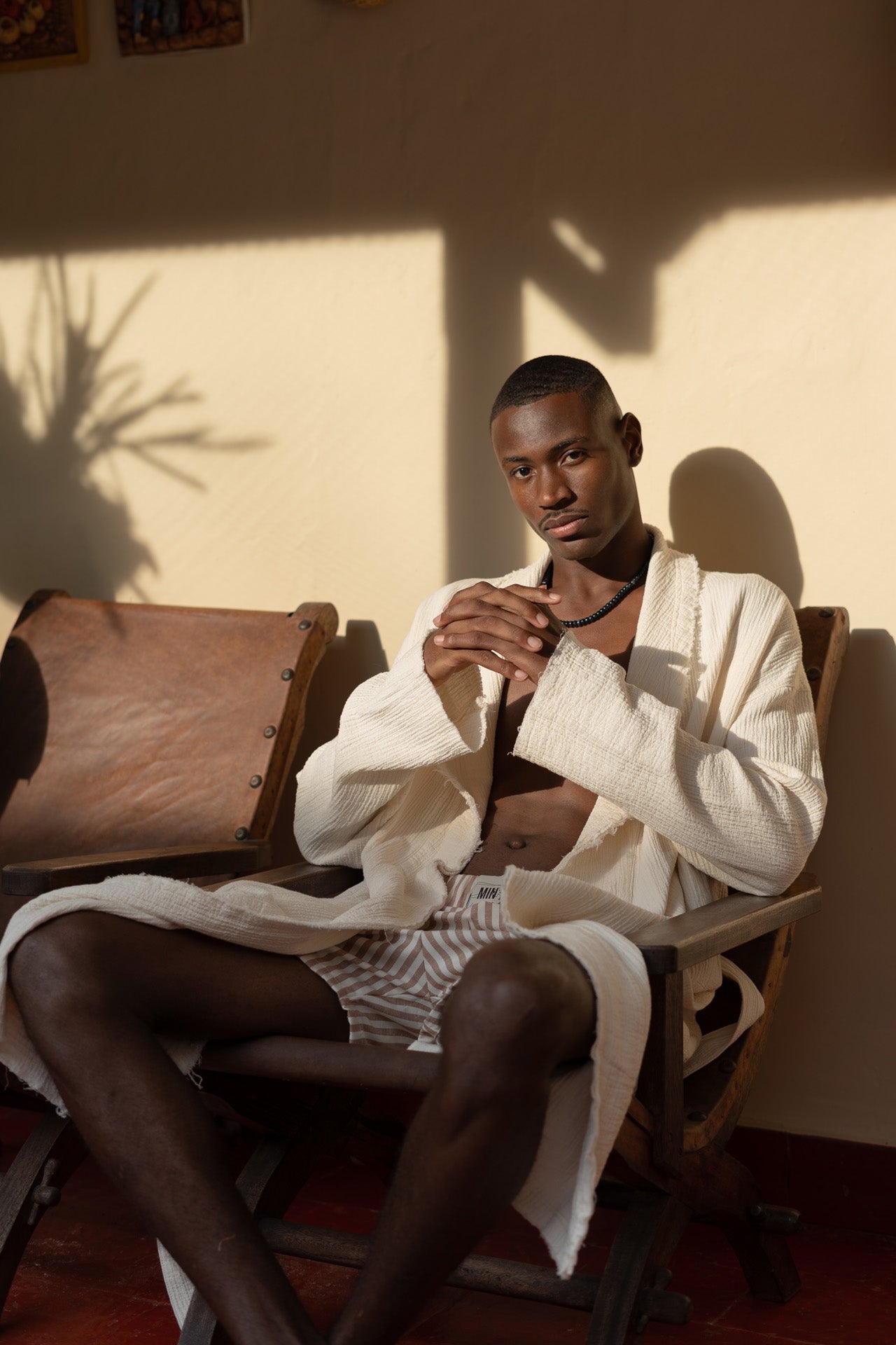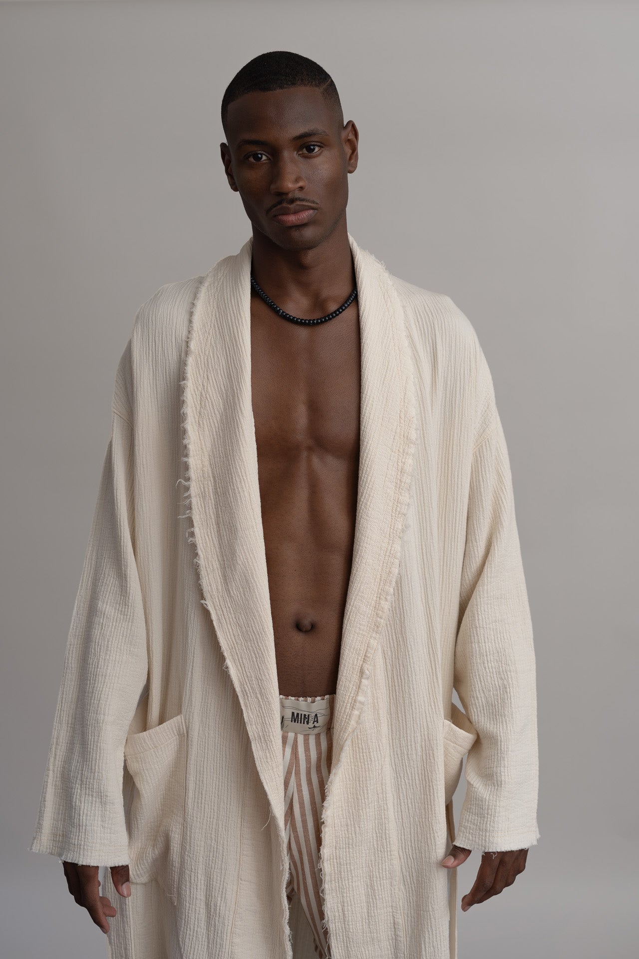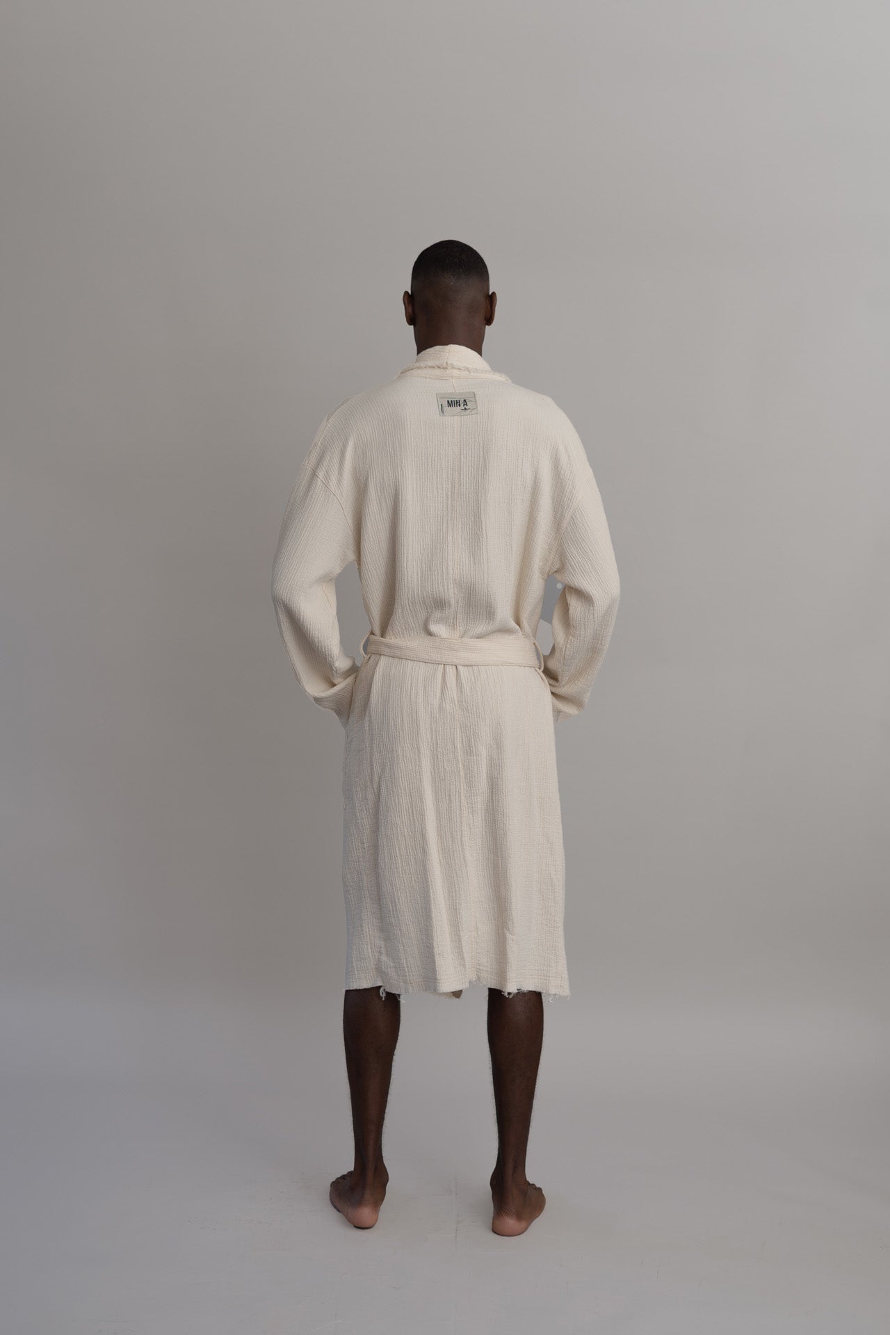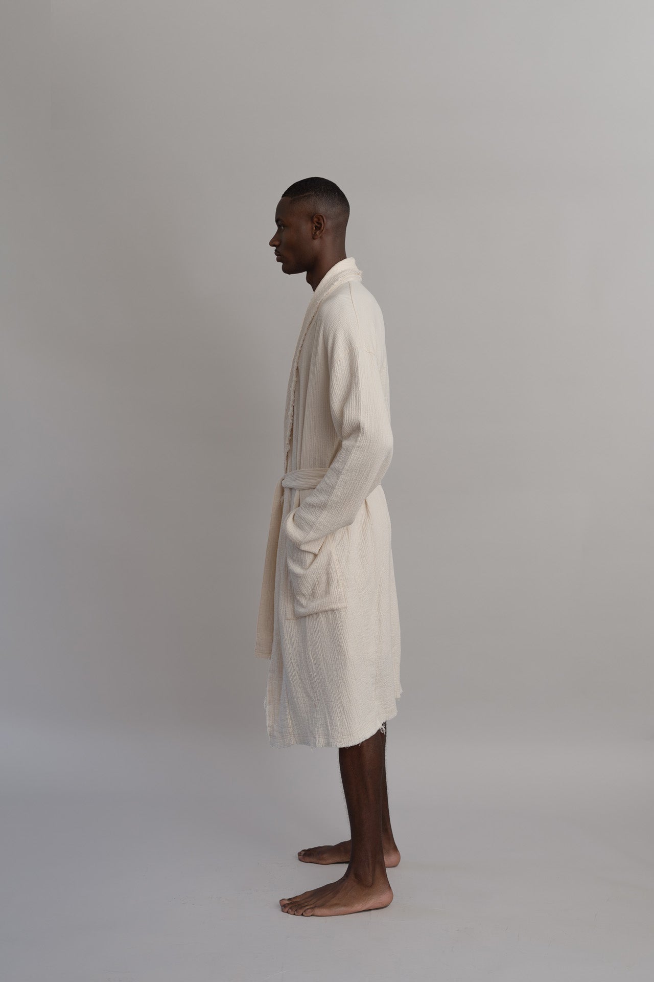 the statement piece de nuestra última colección e inspirada en las prendas que te acompañan a desayunar la Bright Banana Robe es la tercera pieza que se envuelve alrededor del cuerpo y es ideal para crear looks effortless que generan conversaciones. Hecha en algodón 100% orgánico de origen español, con costuras verticales que crean una textura de gran riqueza al taco y visual, teñida en lavanderías con procesos amigables con el medio ambiente en un tono hueso.
