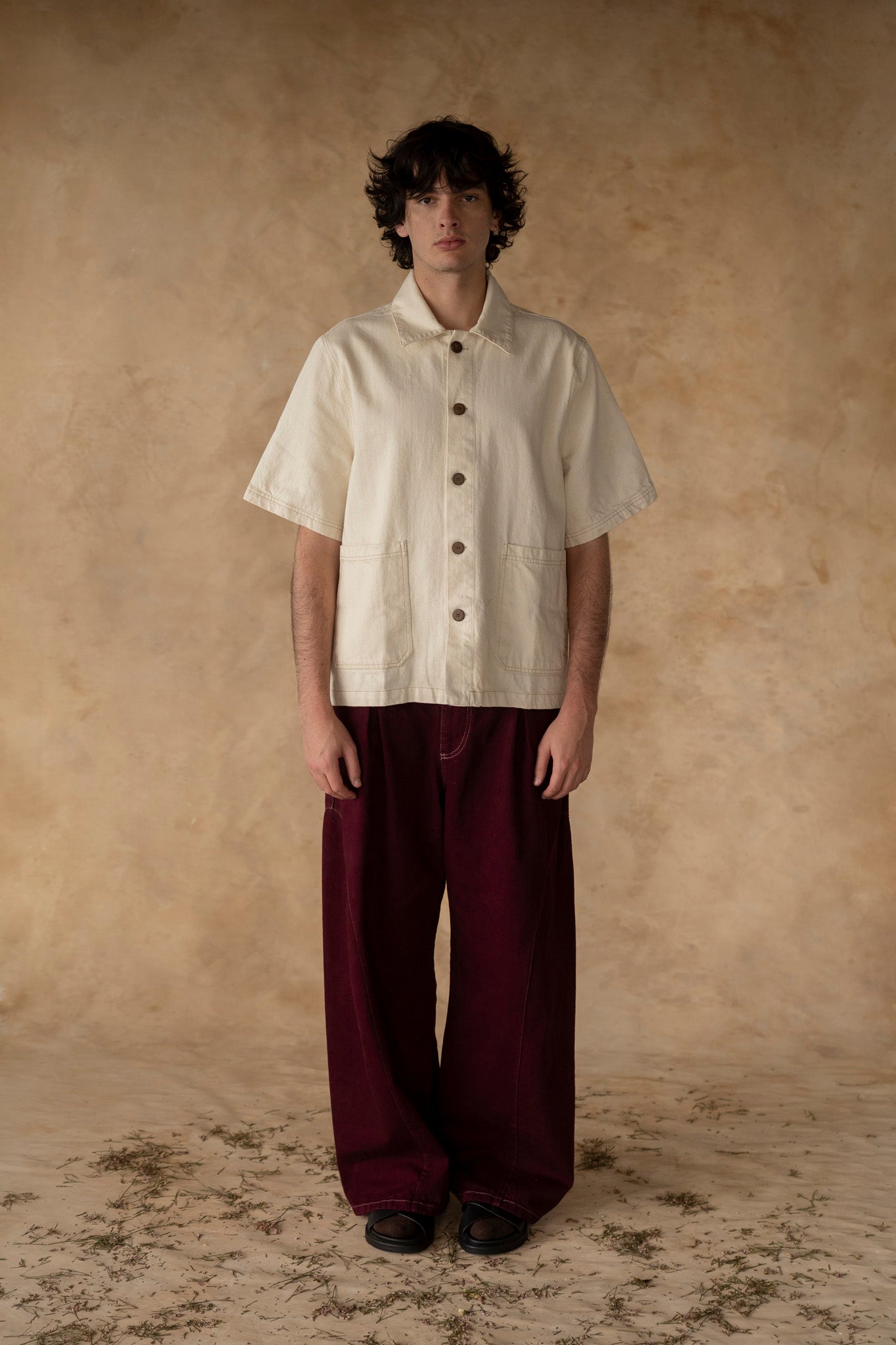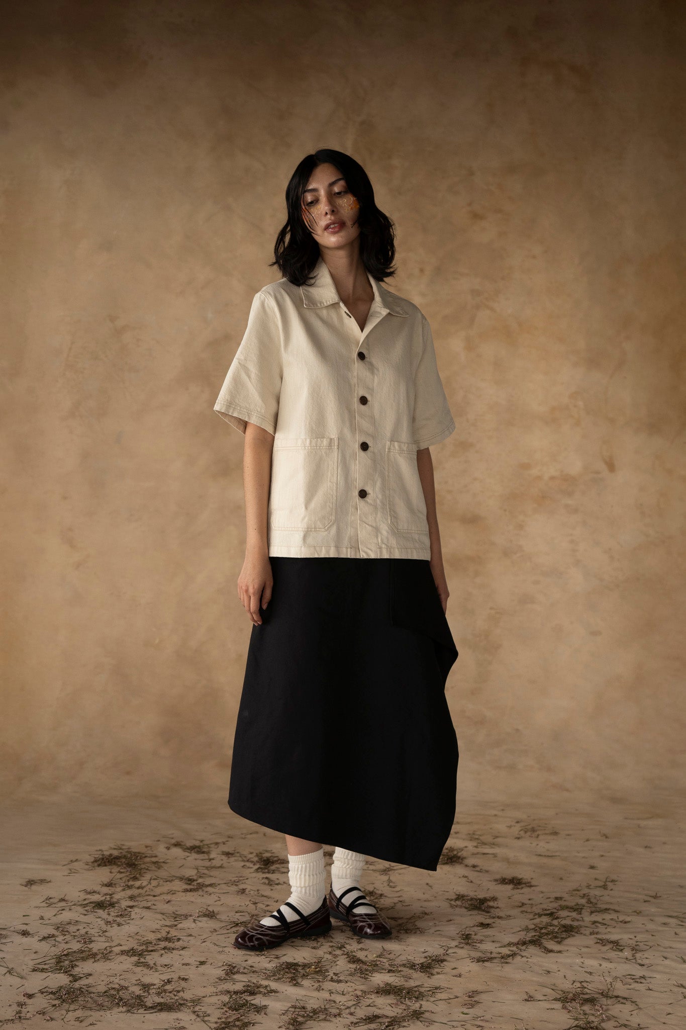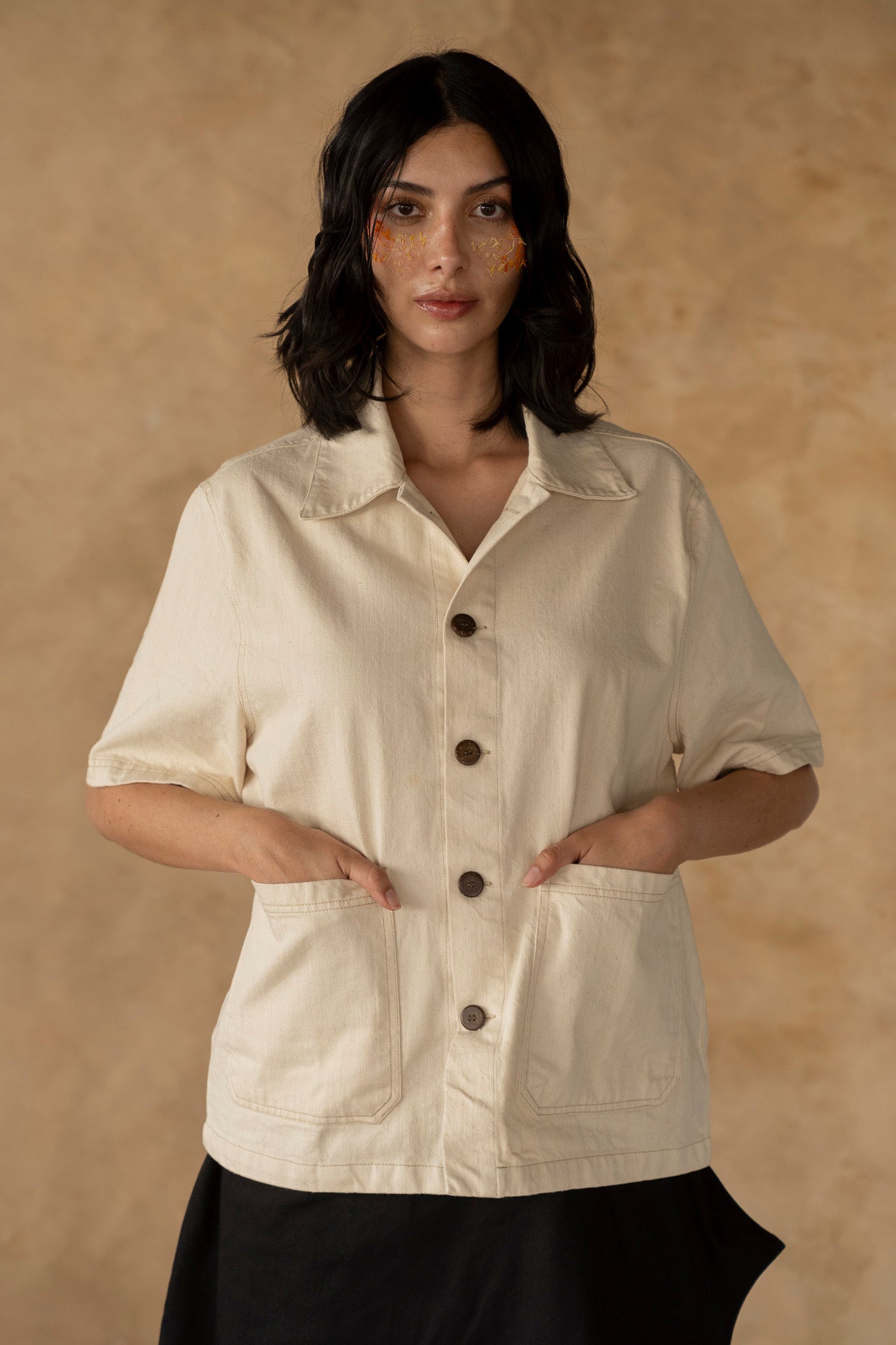 Camisa inspirada en las prendas de trabajo japonesas. De tono crudo, su fit es boxy y el largo llega a la altura de la cadera. Sus botones son de coco y cuenta con costuras en contraste.