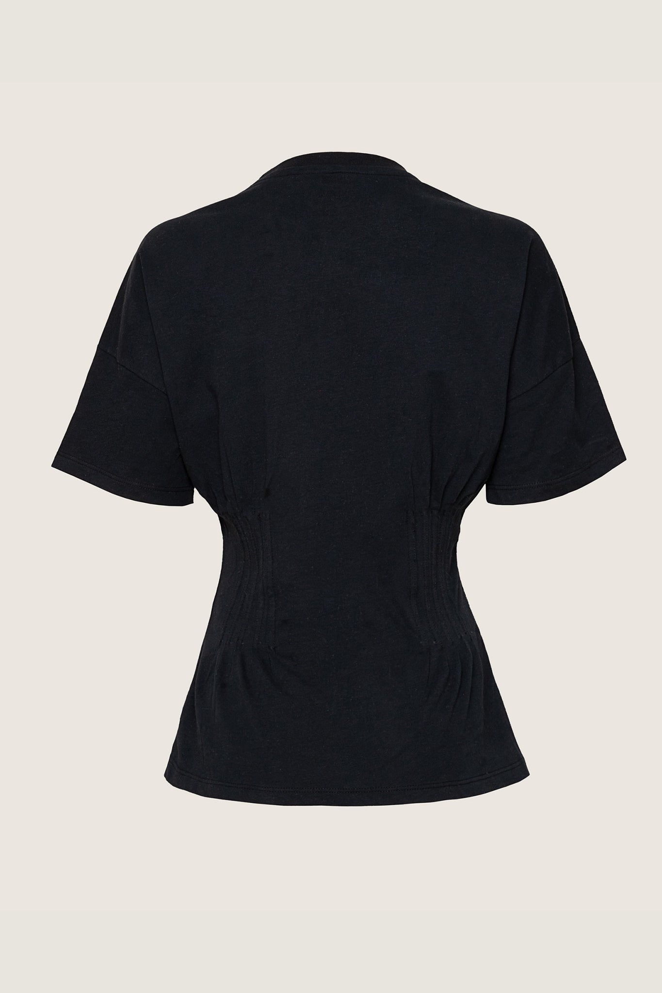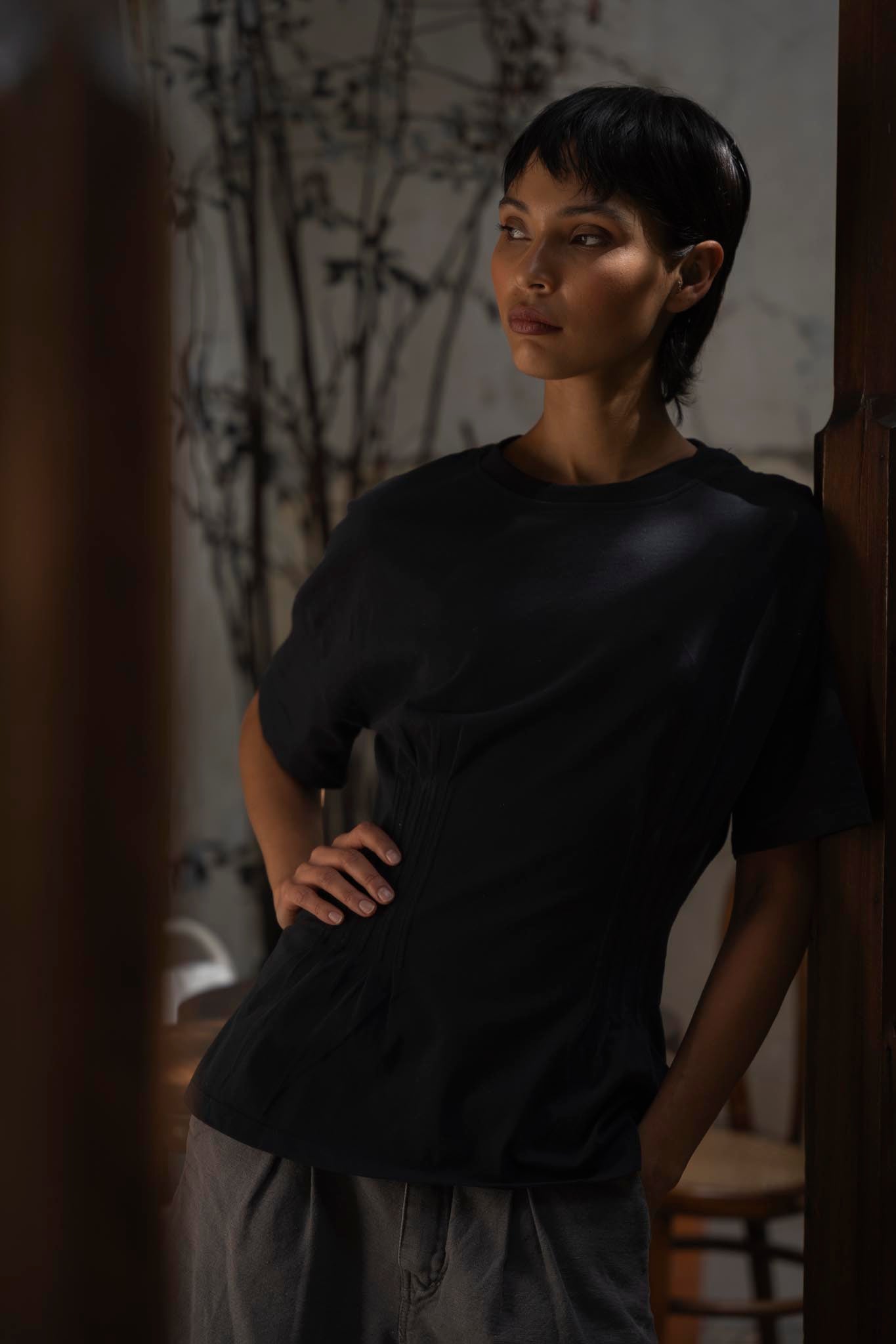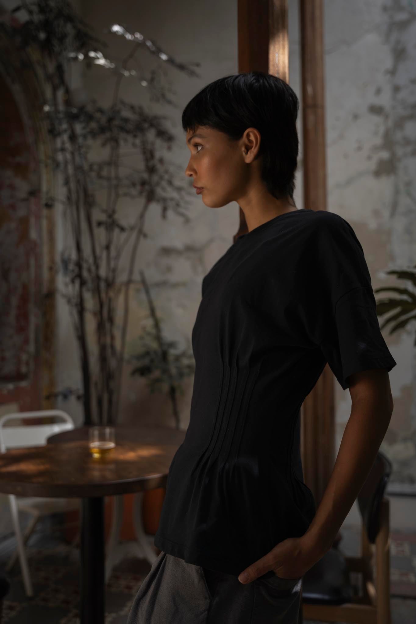 Esta prenda está creada para acentuar la cintura mientras se mantiene el look effortless que caracteriza a la mujer MINKA. Una camiseta de hombro caído y pinzas que marcan la cintura y se abren para terminar en una forma estilo “peplum”. Está hecha en 100% algodón BCI (Better Cotton Initiative) de origen colombiano en un tono gris oscuro. Esta prenda está hecha en su totalidad en Antioquia, Colombia.
