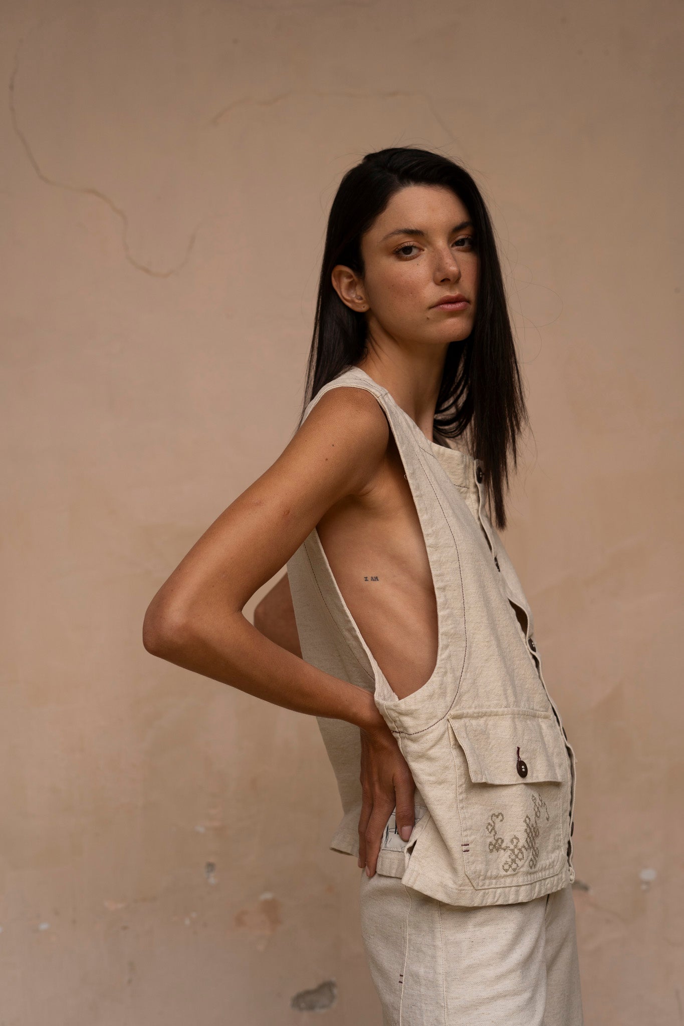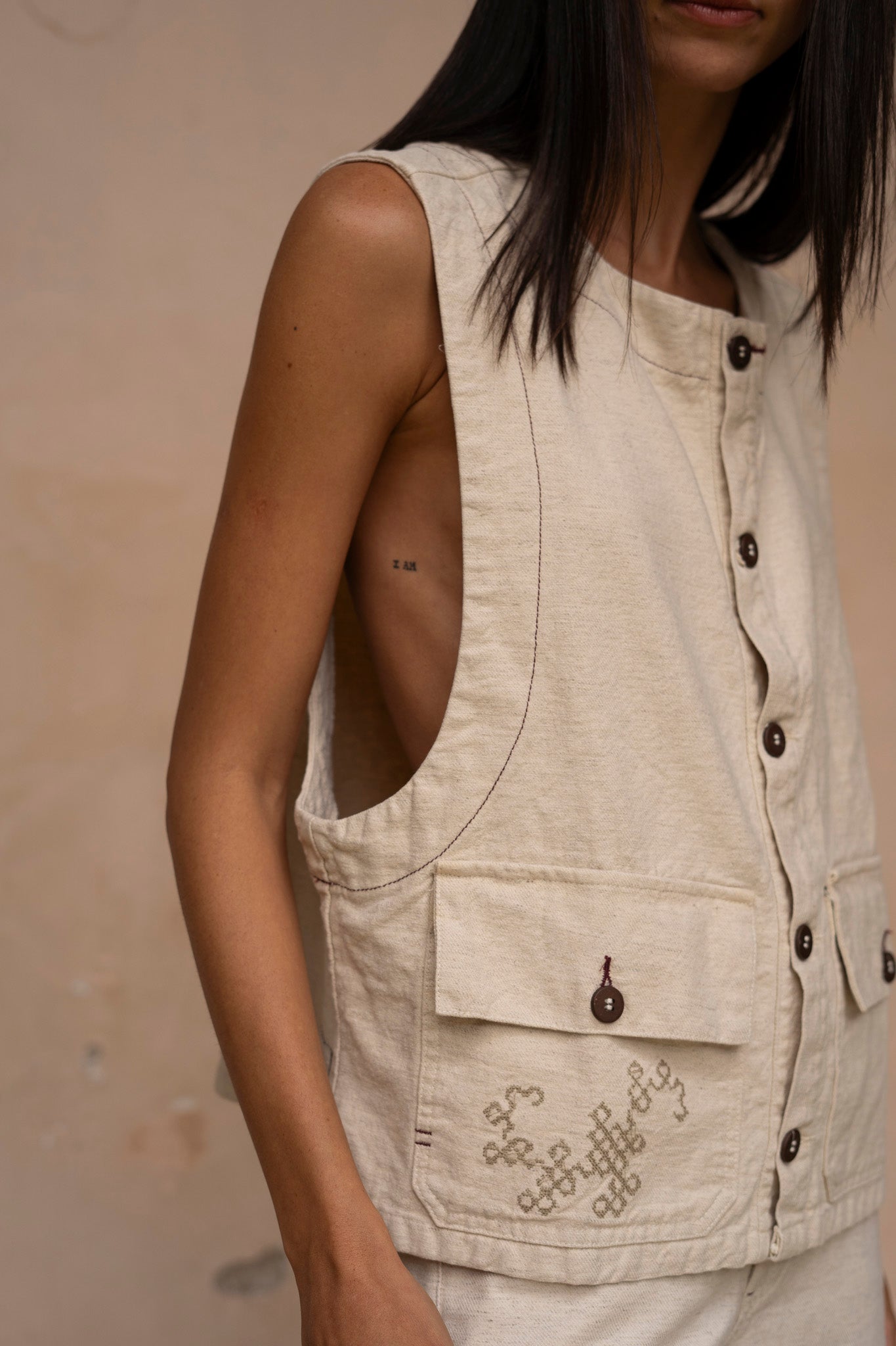 Tercera pieza all-gender diseñada para usarse abierta o cerrada, con bolsillos utilitarios en su parte delantera y el bolsillo derecho tiene un bordado hecho a máquina.