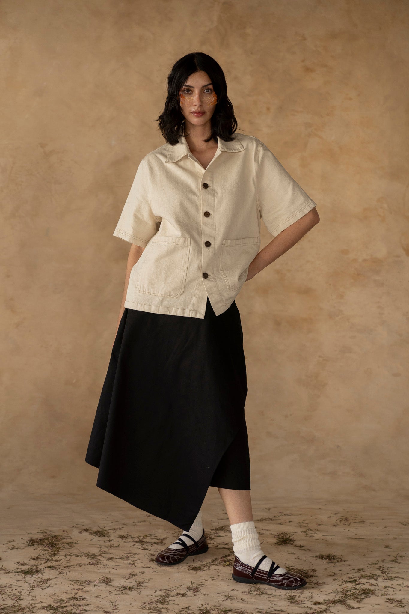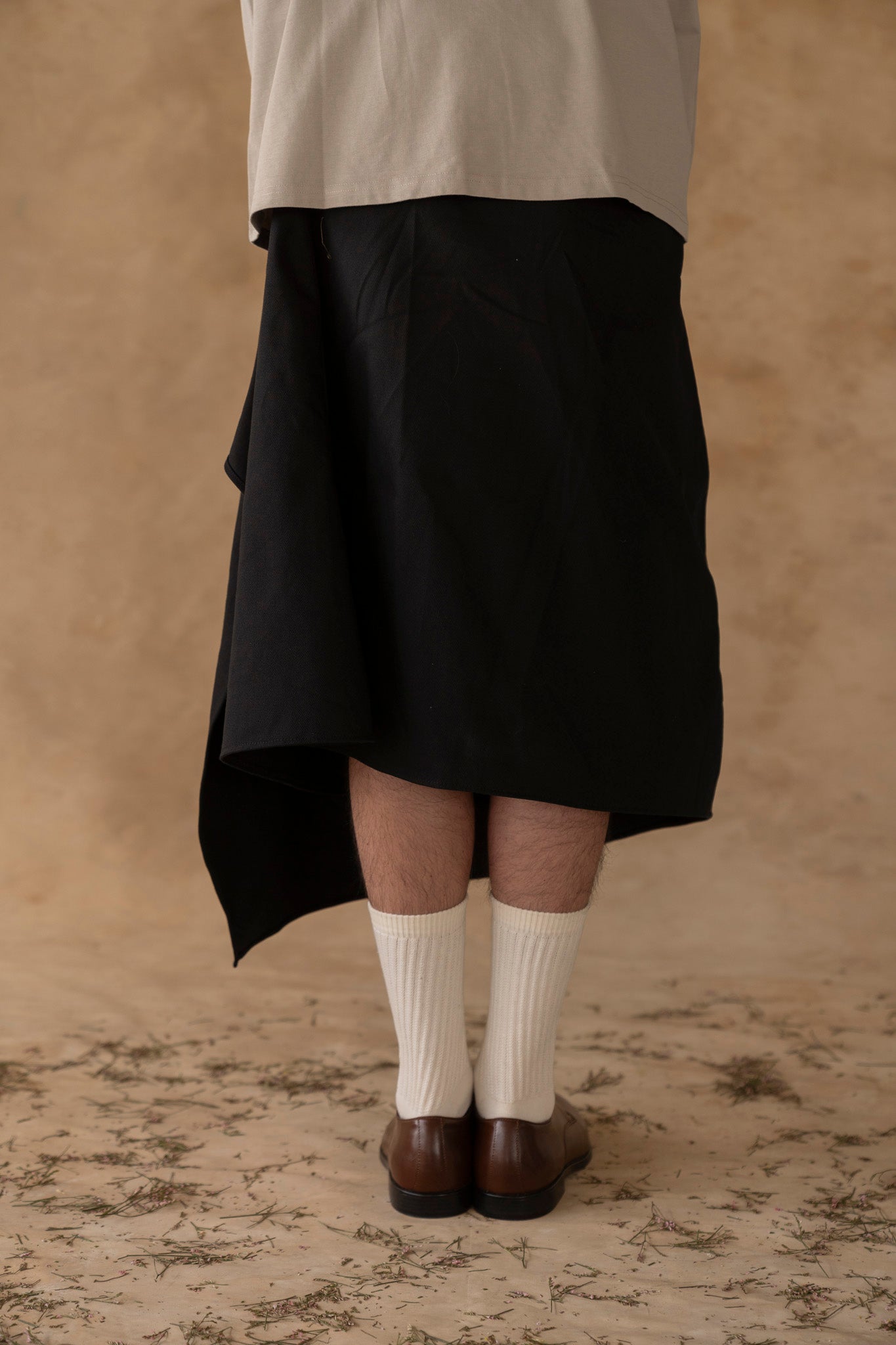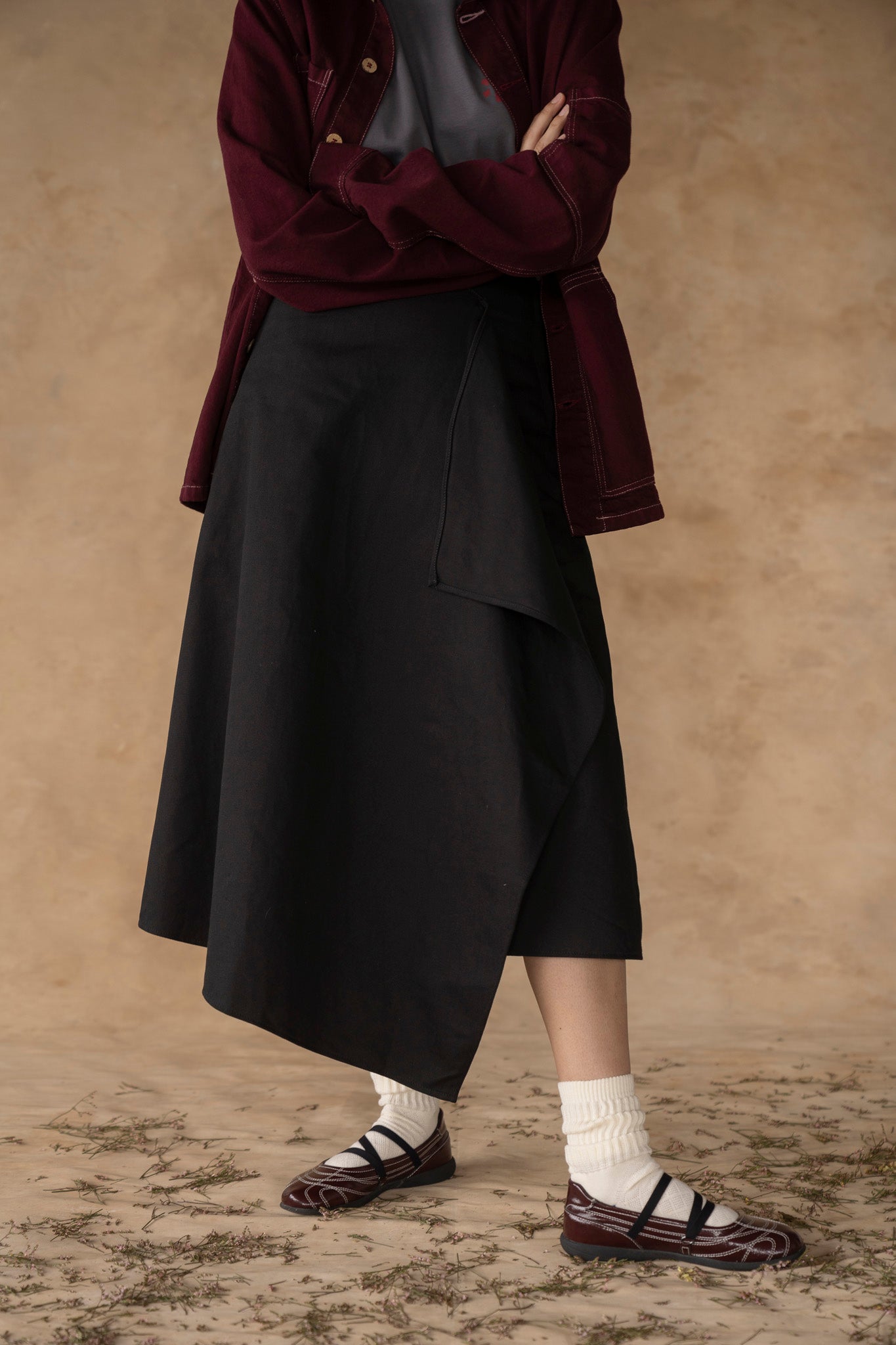Inspirado en nuestro vestido jacaranda, esta falda tiene un corte asimétrico con un bolero que cae en la parte frontal. Ideal para usar solo o con pantalones y crear nuevas siluetas tanto en femenino como masculino.