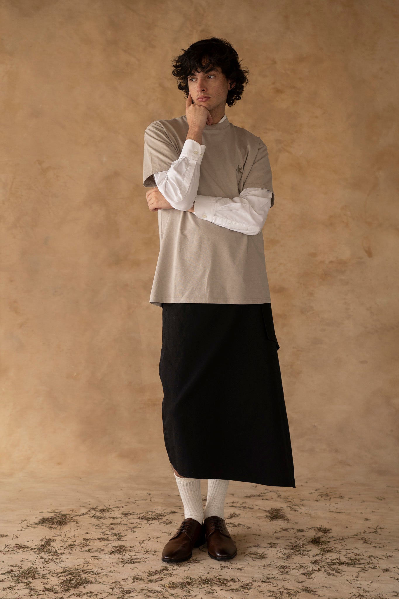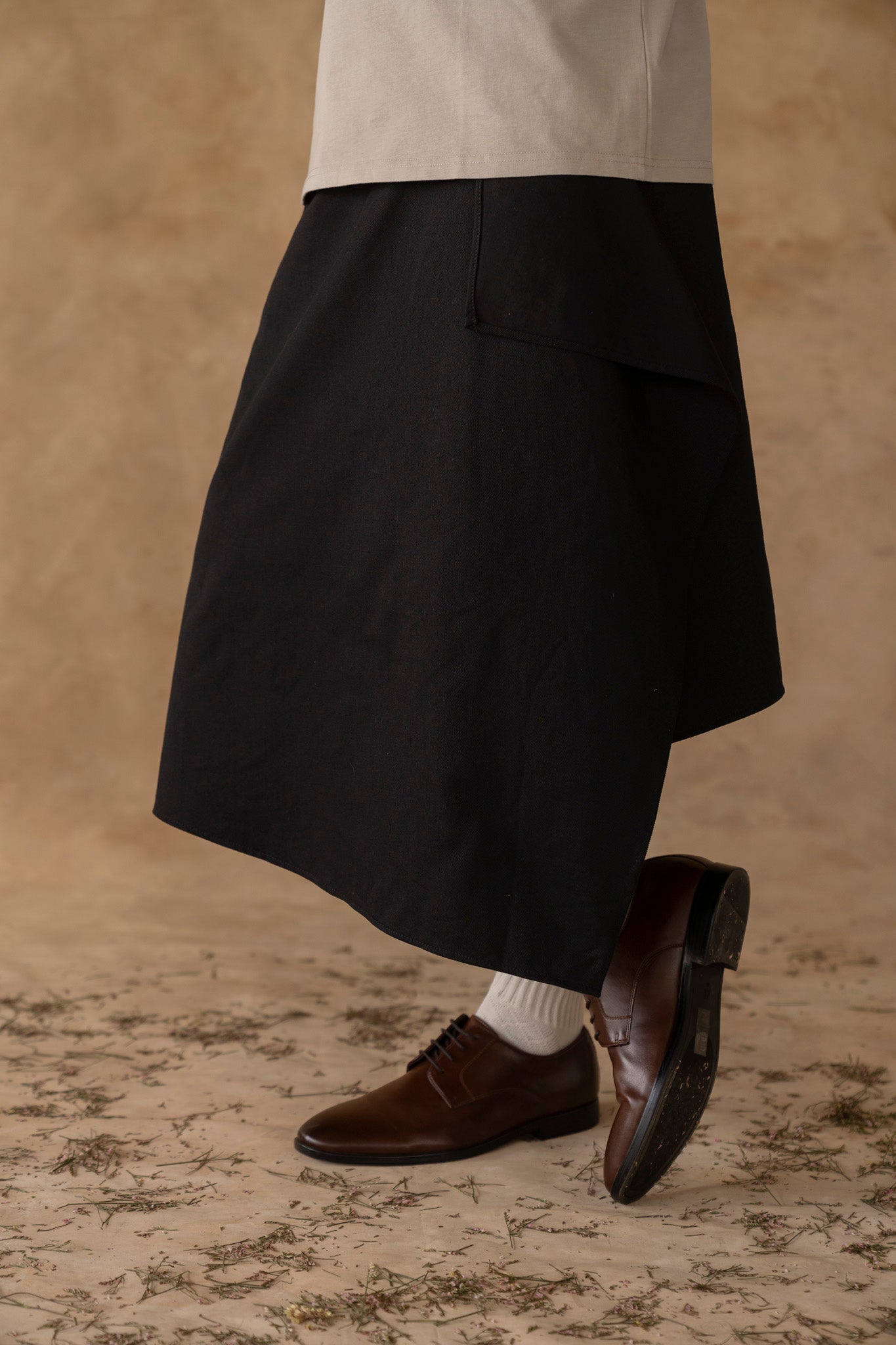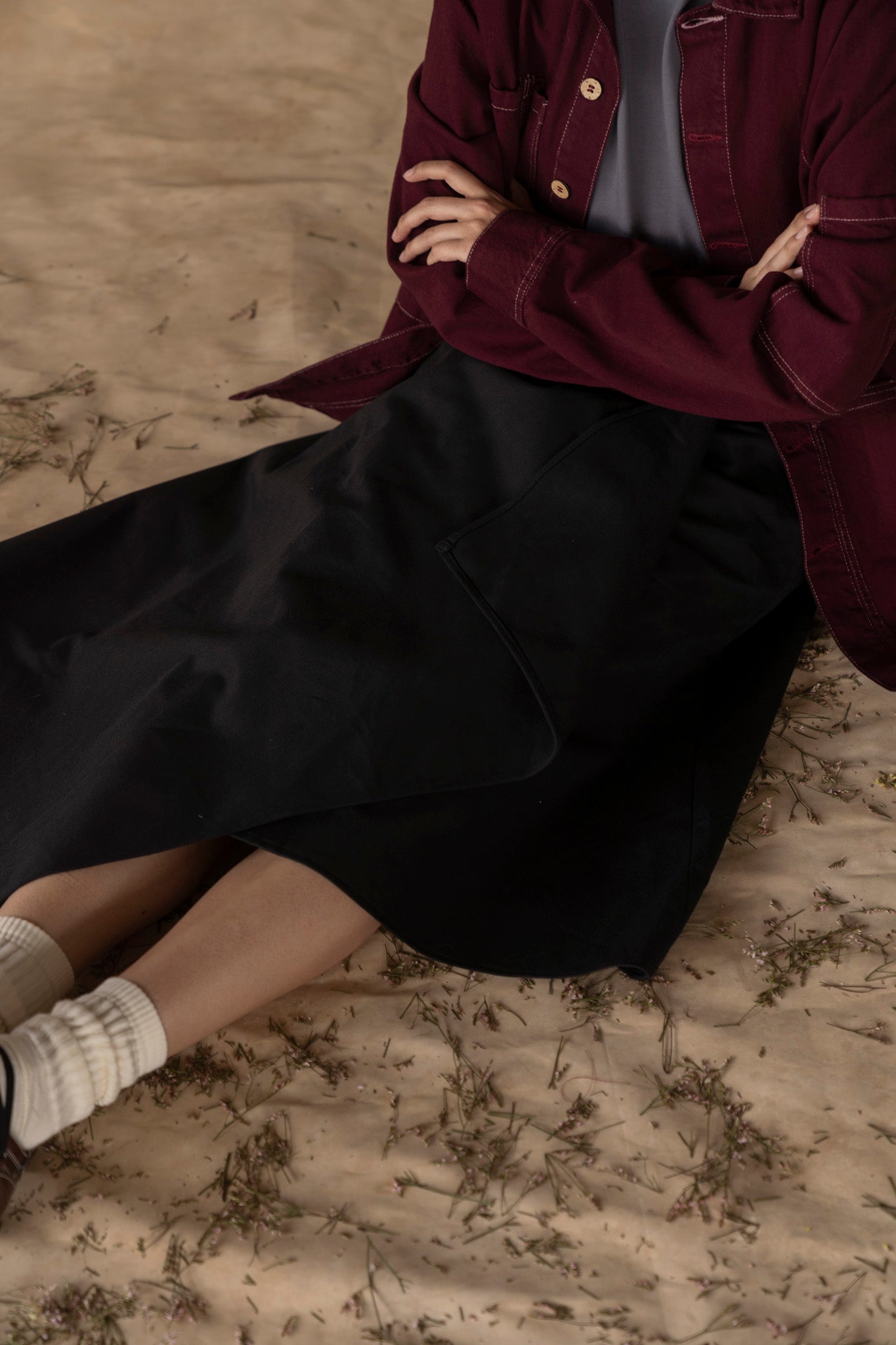 Inspirado en nuestro vestido jacaranda, esta falda tiene un corte asimétrico con un bolero que cae en la parte frontal. Ideal para usar solo o con pantalones y crear nuevas siluetas tanto en femenino como masculino.