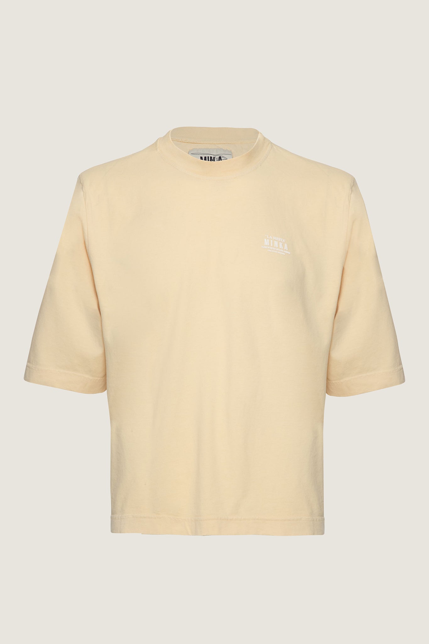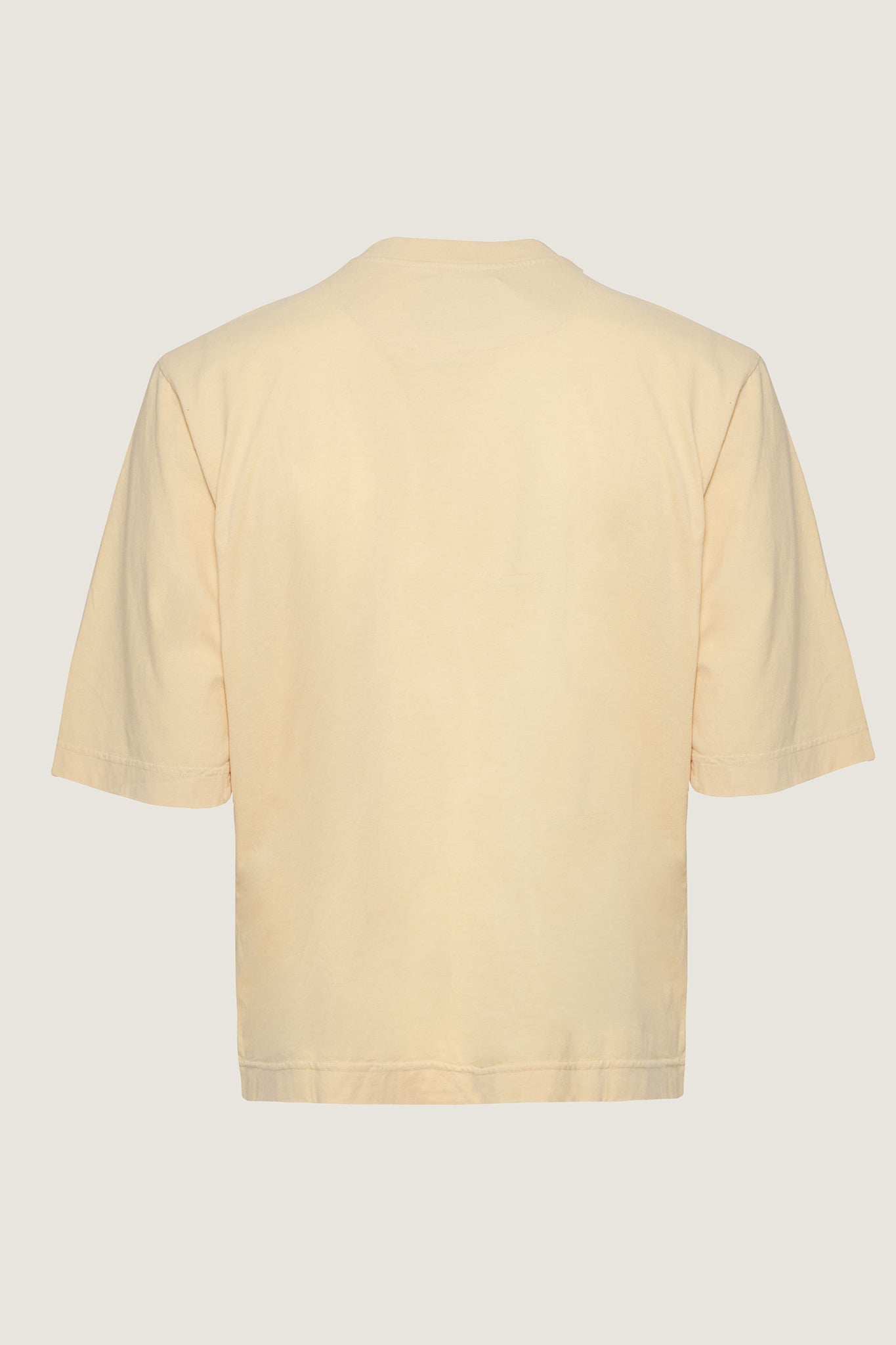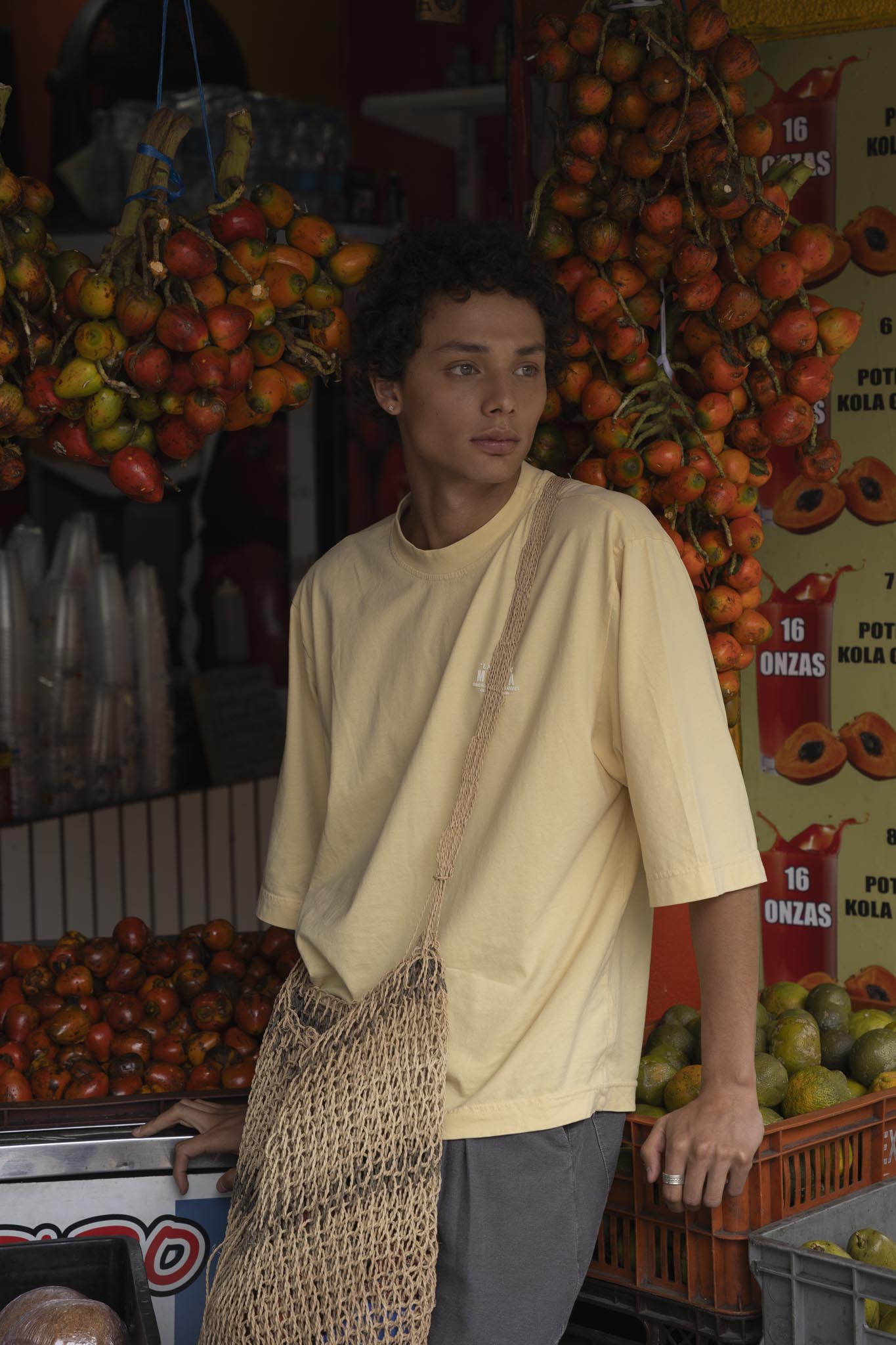 Camiseta hecha en 100% algodón BCI (Better Cotton Initiative) de origen colombiano en un tono mantequilla de textura es sedosa y gramaje medio, su silueta es boxy y oversized, por lo que el largo de la prenda está diseñado para llegar a la línea de la cadera, las mangas son un largo tres cuartos y siguen la forma de los brazos. Tiene un estampado en alto relieve, en punto corazón con el nombre de la colección “La siesta”. Esta prenda está hecha en su totalidad en Antioquia, Colombia.