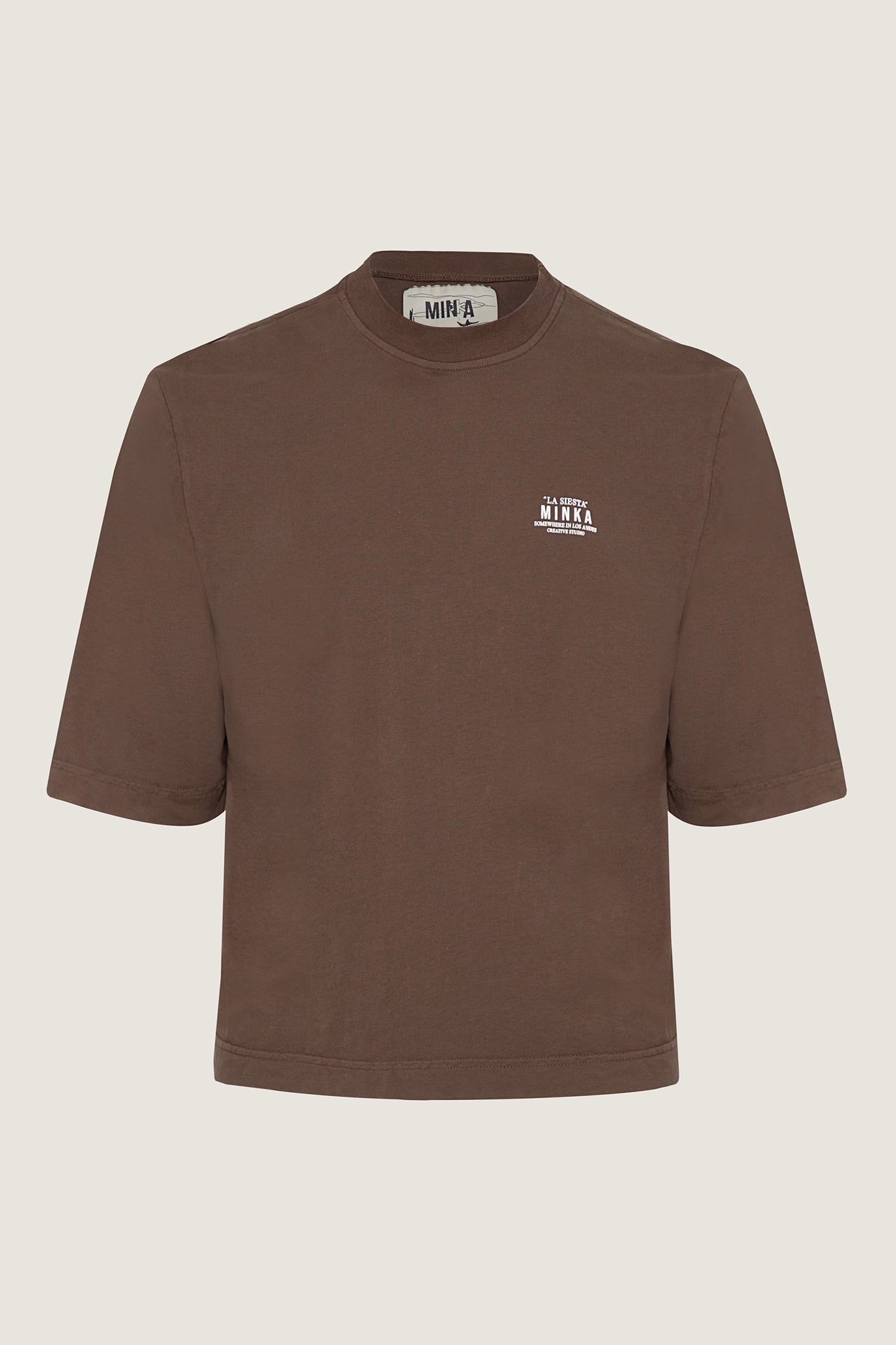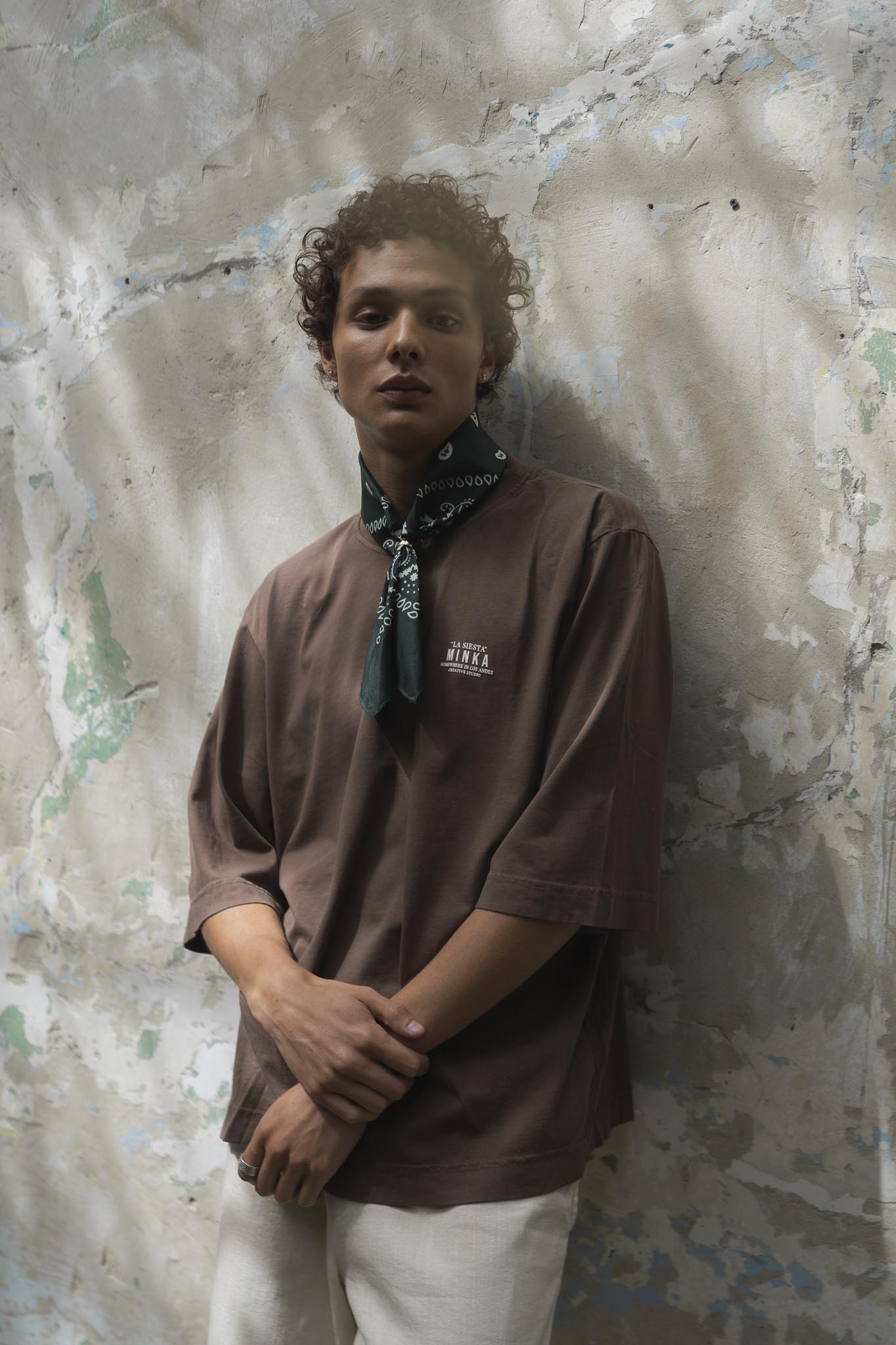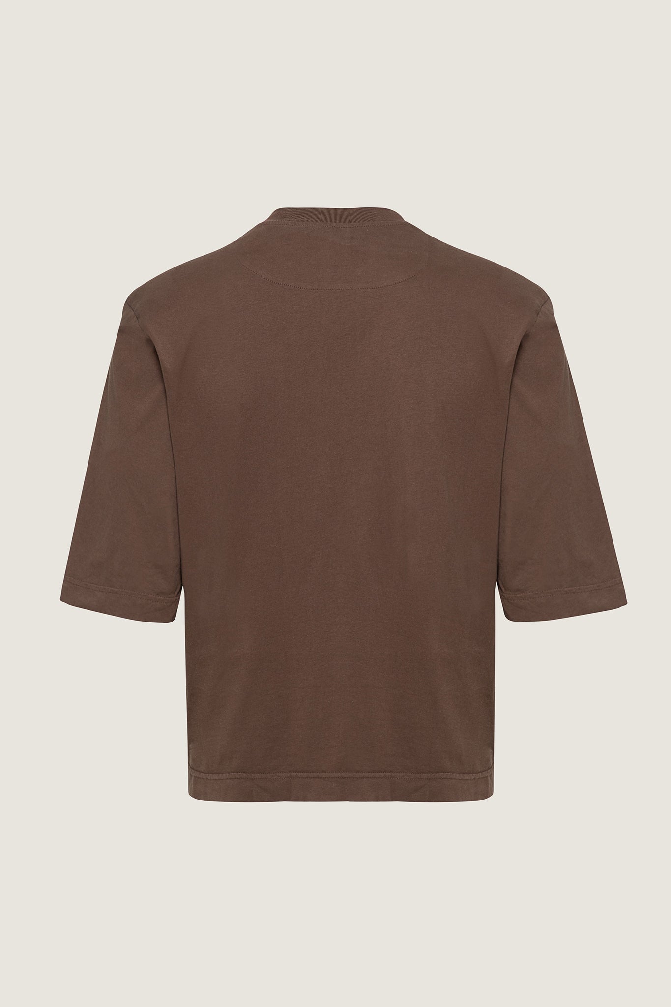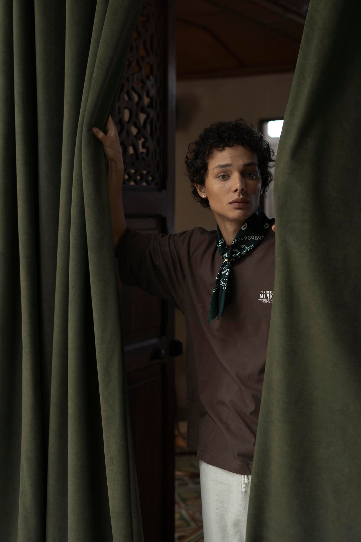 Camiseta hecha en 100% algodón BCI (Better Cotton Initiative) de origen colombiano en un tono chocolate de textura es sedosa y gramaje medio, su silueta es boxy y oversized, por lo que el largo de la prenda está diseñado para llegar a la línea de la cadera, las mangas son un largo tres cuartos y siguen la forma de los brazos. Tiene un estampado en punto corazón con el nombre de la colección “La siesta”. Esta prenda está hecha en su totalidad en Antioquia, Colombia.