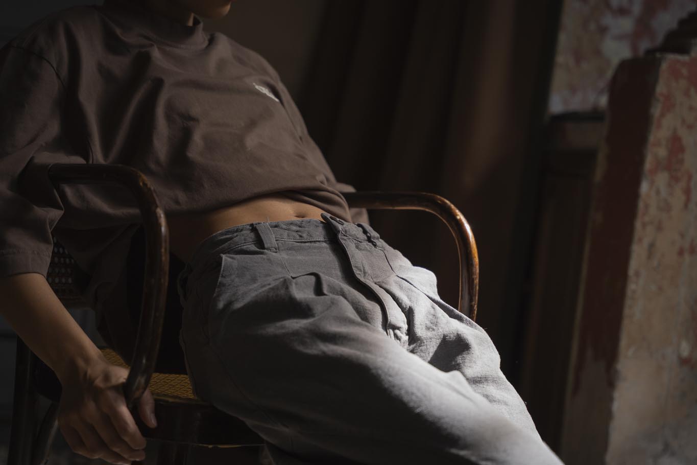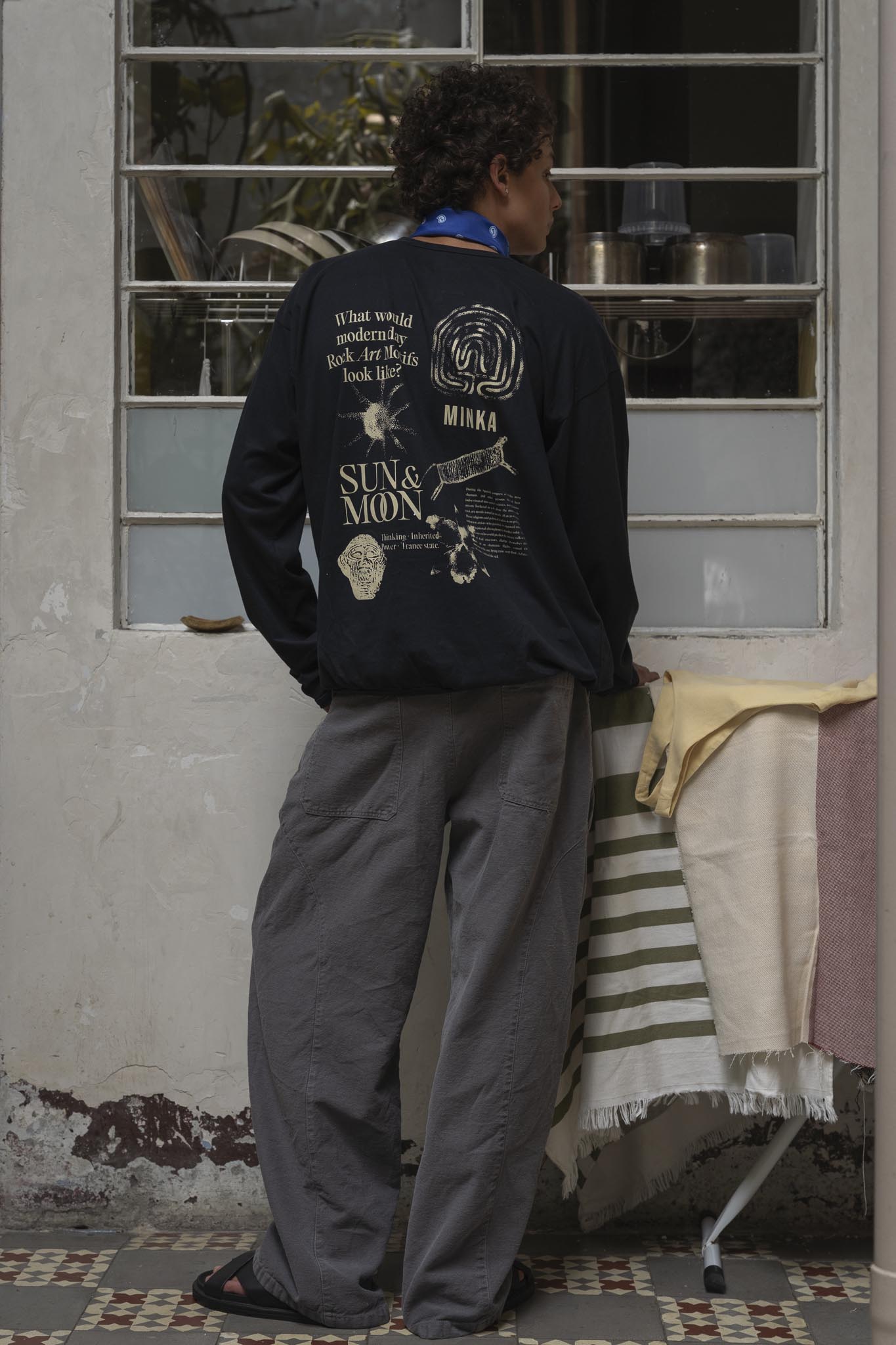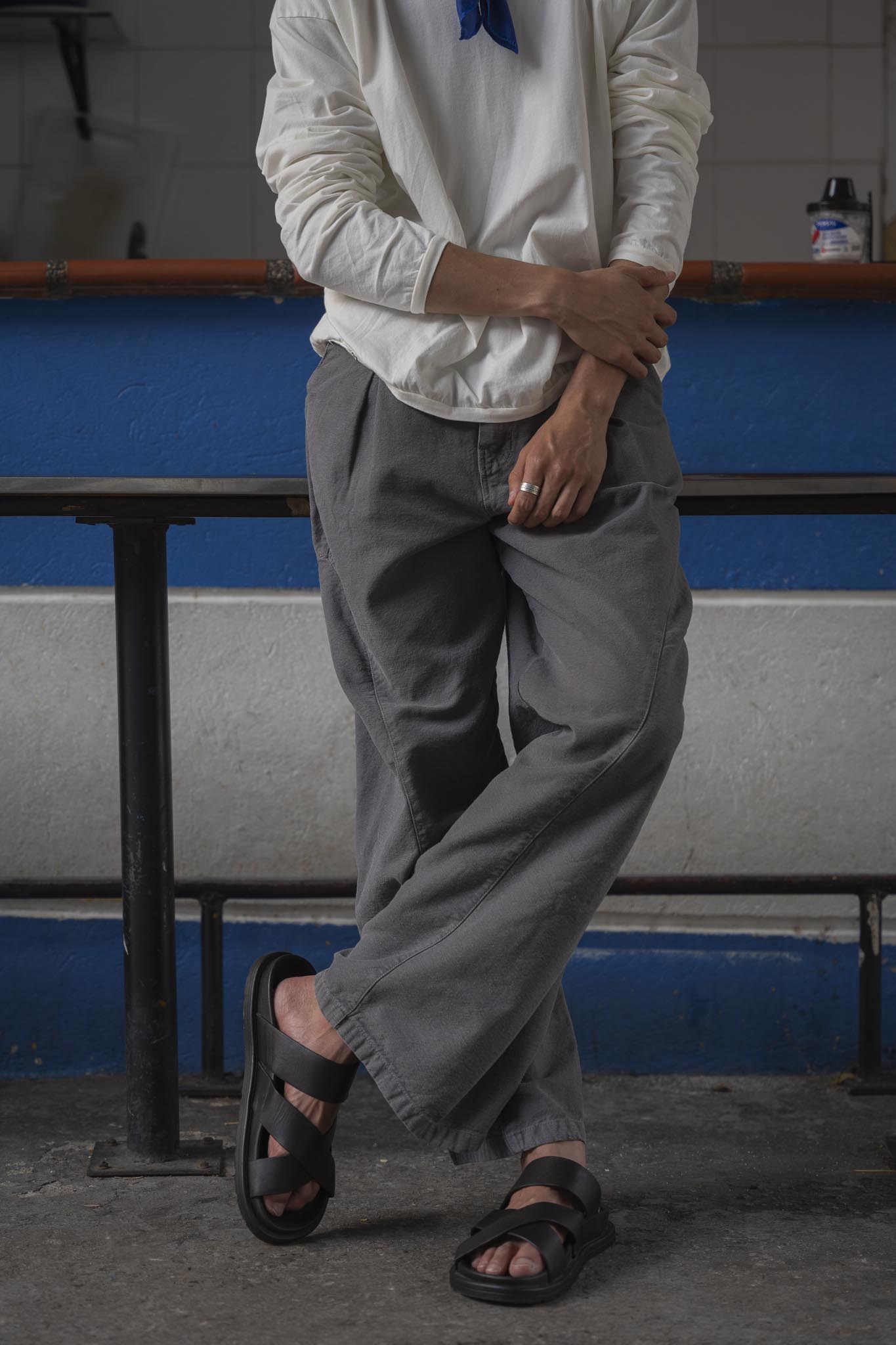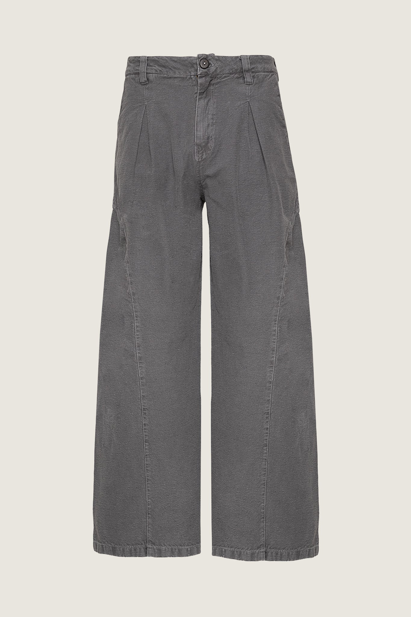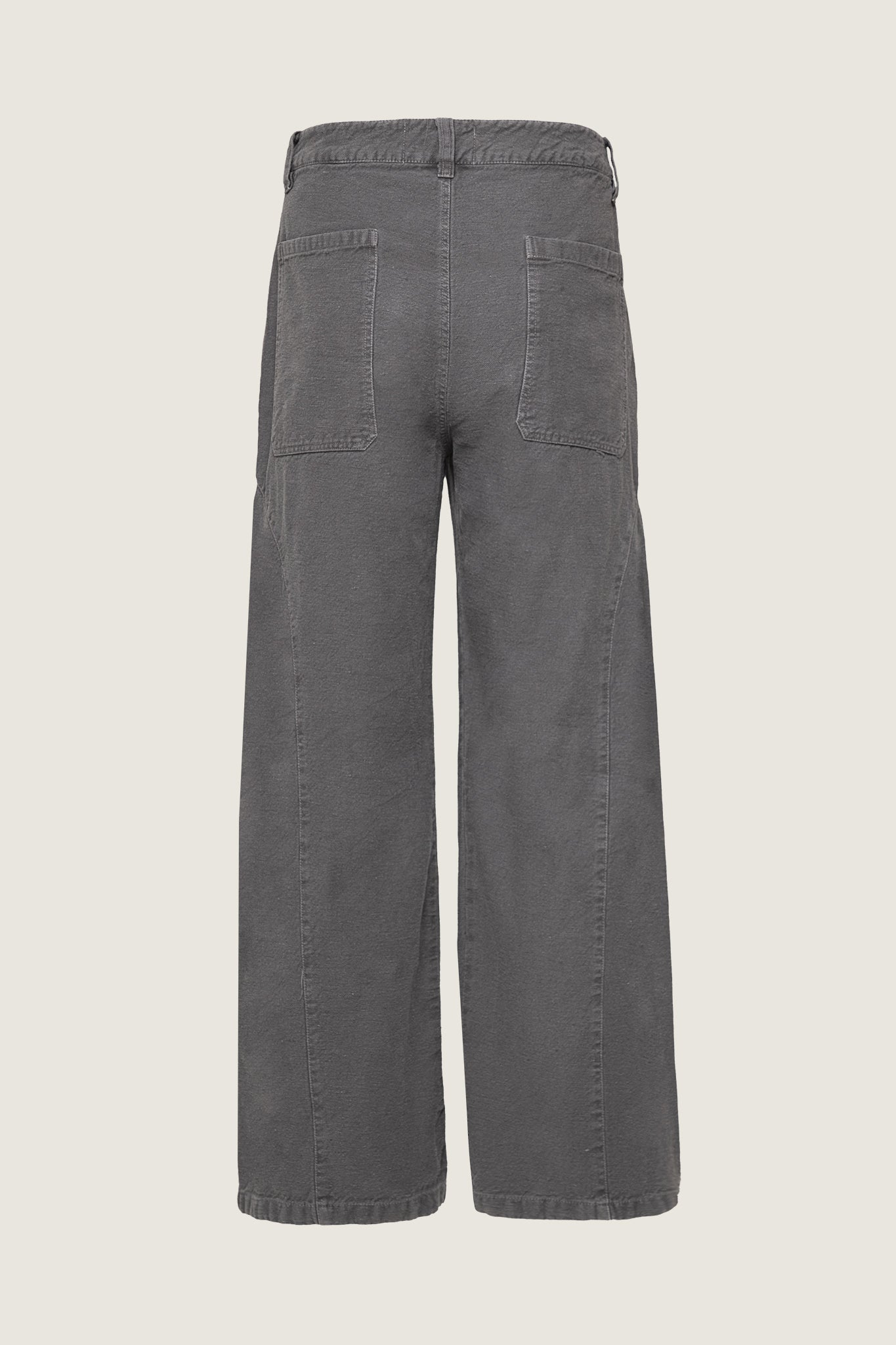 Pantalón all-gender de cintura ceñida y bota ancha, con cortes circulares en la parte de lateral que recorre el delantero y el posterior. Tiene prenses en la parte delantera inspirados en la sastrería masculina.
