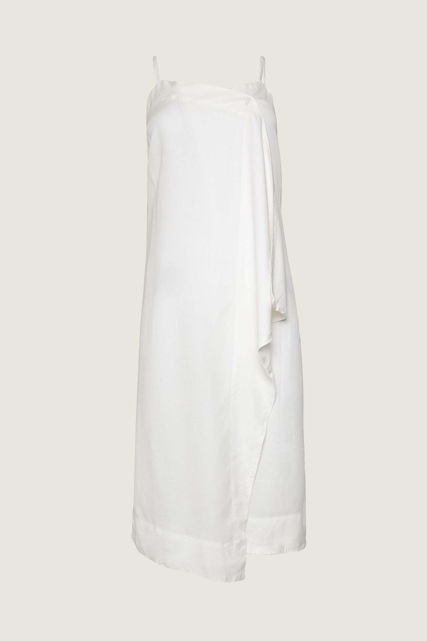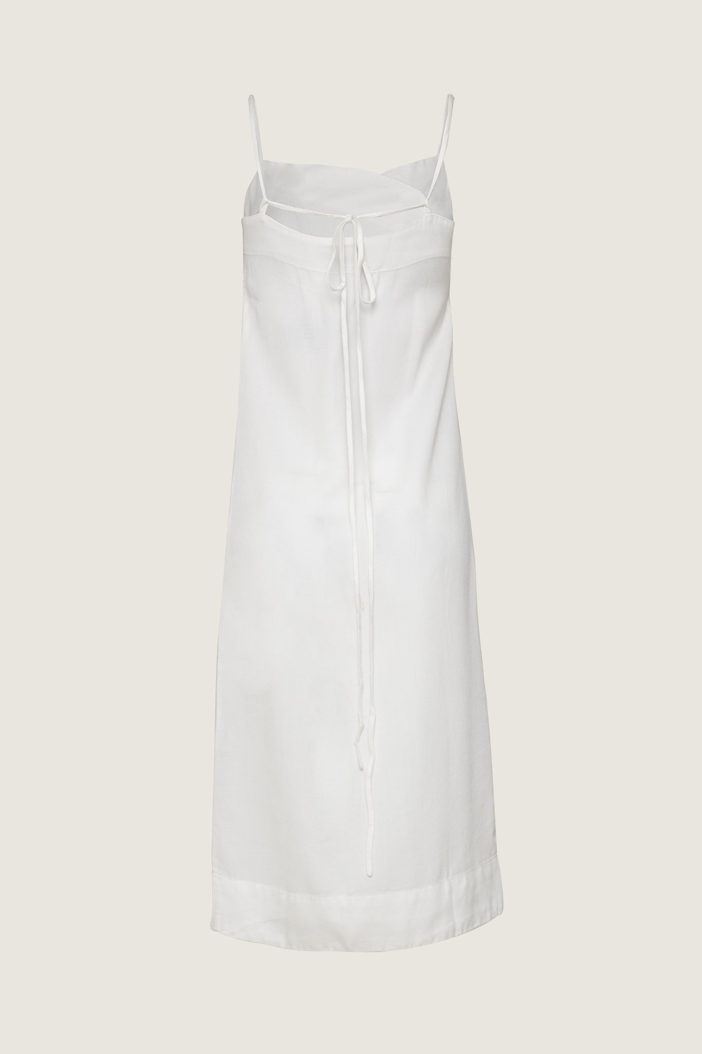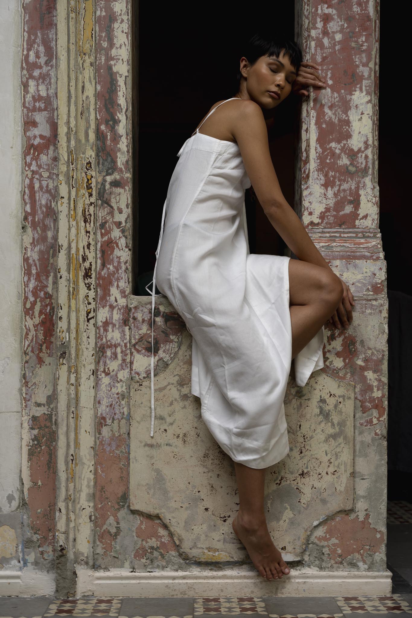 Este es un vestido fluido en tono Ivory que envuelve el cuerpo y que cuenta con tiras regulables en la parte posterior, su cuello es recto y en la parte frontal cae de forma asimétrica. Está hecha en fibras de Tencel de origen latinoamericano, un textil con grandes propiedades como su biodegradabilidad y su frescura. Su textil cuenta con sello OECOTEX lo que significa que no contienen químicos ni sustancias nocivas para la salud.